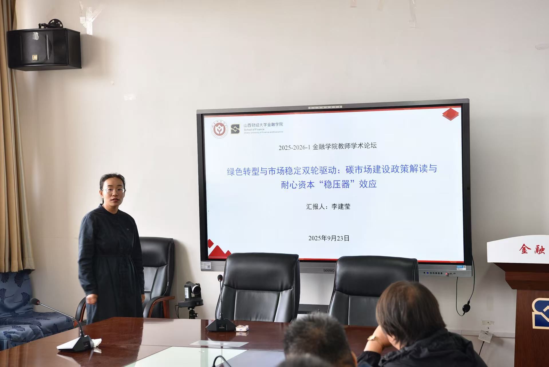 2025年9月23日下午,偷拍视频 举办“教师学术论坛”第13期活动。金融工程教研室青年教师李建莹作了题为“绿色转型与市场稳定双轮驱动:...