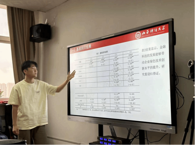 在本次学术沙龙中,闵唯同学首先从当前政策背景出发,指出金融科技对于企业绿色创新具有重要意义,在理论分析的基础上,进一步地引入了风险机制,投资机制和责任机制,并提出假设。随后,温泽平同学利用2011至2021年间沪深A股上市公司数据,用基准回归模型讲解了实证检验的部分,并重点讲解了运用工具变量法和安慰剂检验解决内生性问题,以及金融科技在“短板”环境下的赋能效果检验,最后,根据结论提出了相应的政策建议。