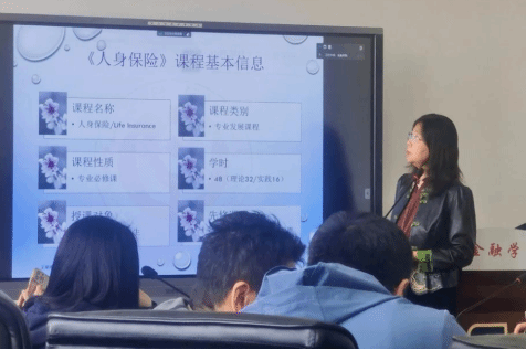 王朝晖老师从课程基本信息、课程结构与内容、课程建设过程和内容、案例教学分享等几个方面对《人身保险》课程的集体备课情况及特色进行了介绍。