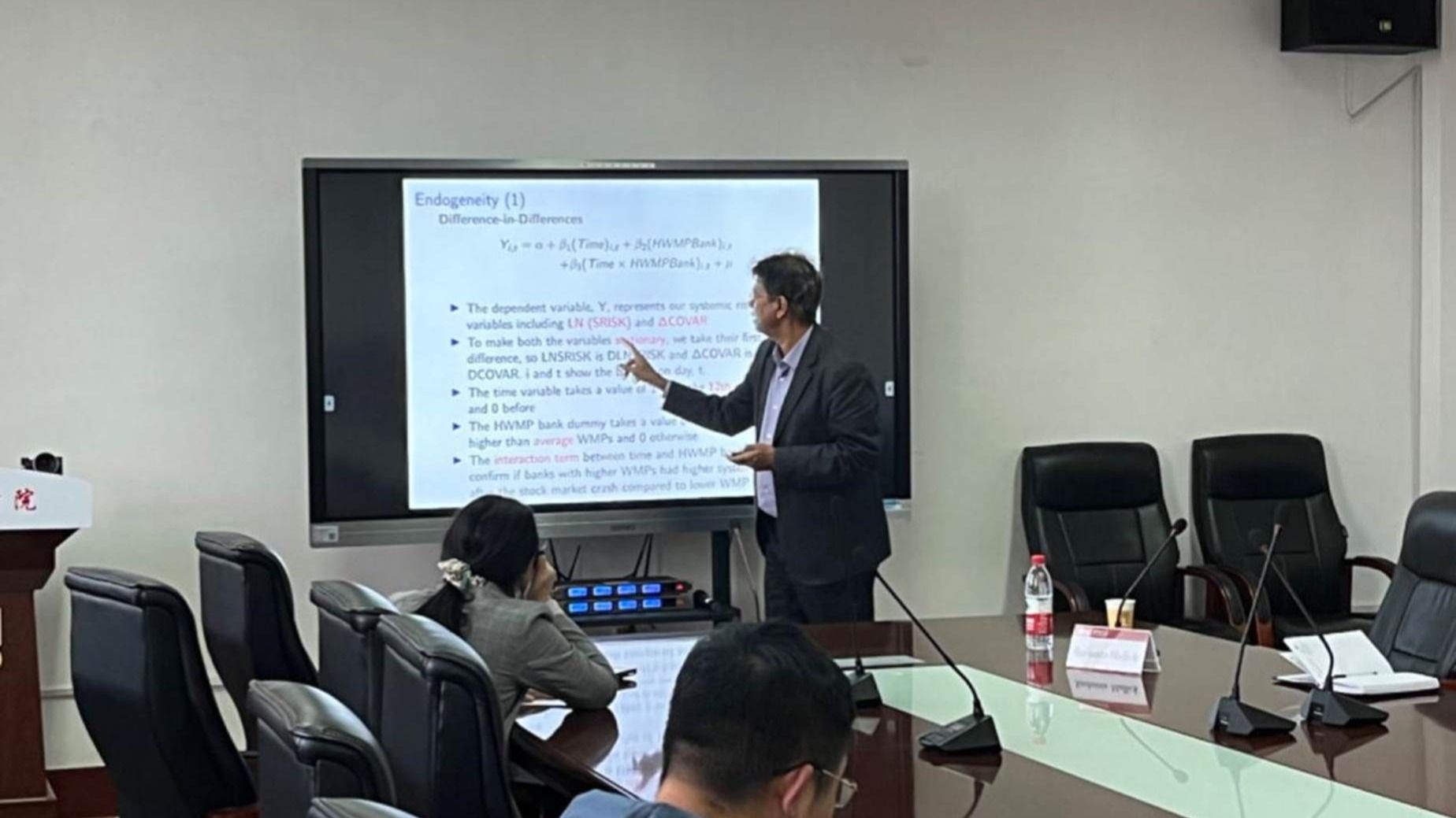 Prof. Sushanta reviewed the research progress on bank wealth management products and systemic risk, discussed the impact of financial products on systemic risk under different sources of funds, and explained its mechanism; According to the data of 37 Chinese listed banks, he established an empirical model of the impact of wealth management products on systemic risk based on calculating the systemic risk using the baseline methodology, and had conclusions which are significant to the reality.