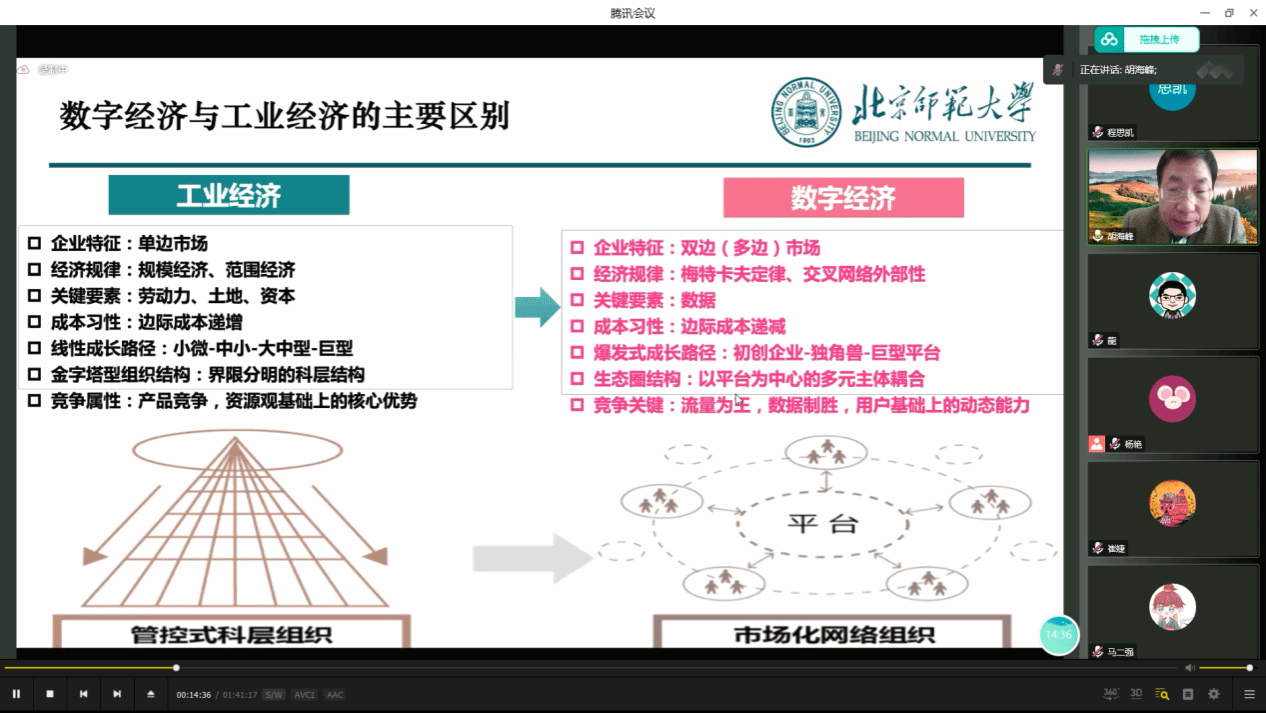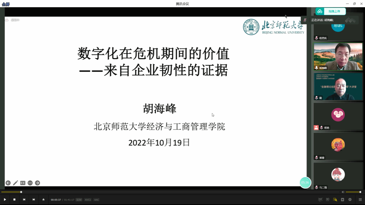 副校长沈沛龙教授主持,邀请到了北京师范大学经济与工商管理学院金融系主任胡海峰教授讲解了一篇题为“数字化在危机期间的价值——来自企业韧性的证据”的精彩的学术报告,参会人员包括偷拍视频